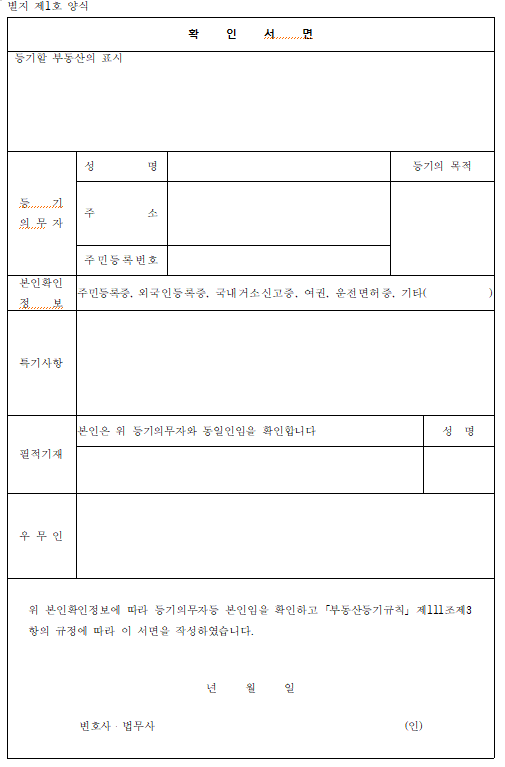 확인서면은 등기할 등기권리증 (등기필증)을 분실 했을 때 작성하는 문서로서 법무사 또는 변호사에게 본인이 진정한 소유자임을 확인하고 작성하는 서류 입니다. 법무사나 변호사가 소유자를 확인했다는 것을 보증하는 서류 입니다.