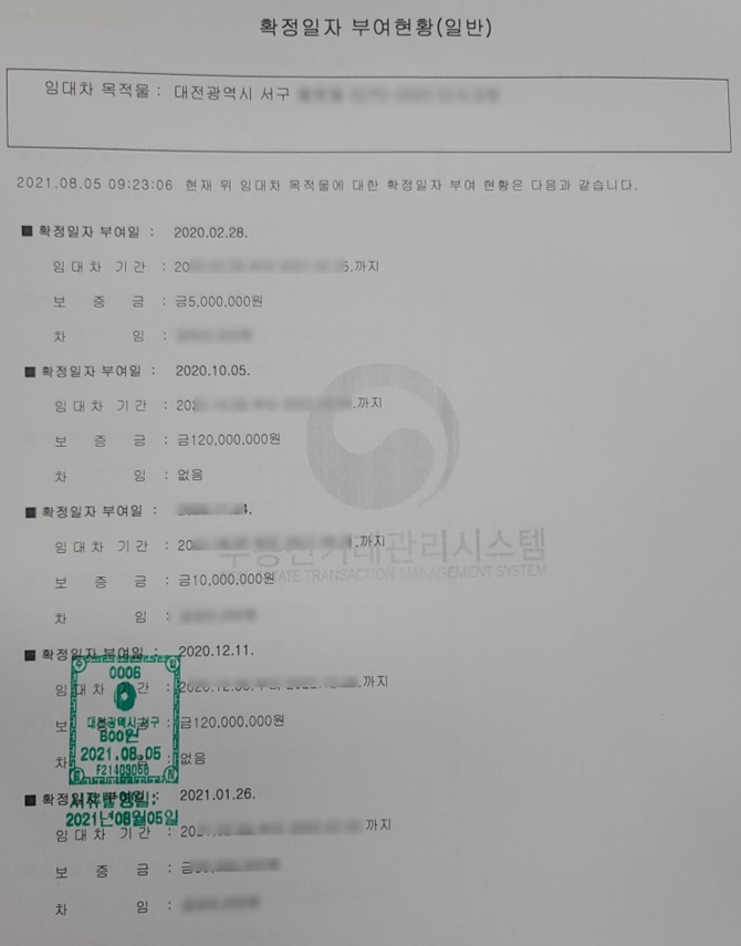 하지만 새로 집을 구하는 임차인이 선순위 권리를 알수가 있기가 어렵기 때문에 불완전한 계약이 될수 있으므로 부동산을 통해서 계약을 할때는 선순위 권리를 알수 있는 <확정일자부여현황>과 <전입세대열람원>을 제시 받아 계약을 해야 합니다.
