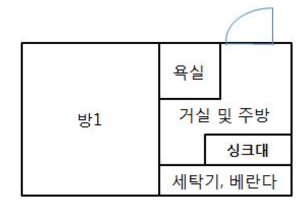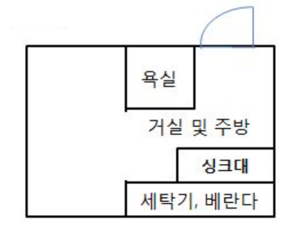 방겸 거실이 크게 하나가 있고 오른쪽에 화장실, 왼쪽에 세탁기 놓는 공간이 구분되어 있습니다.