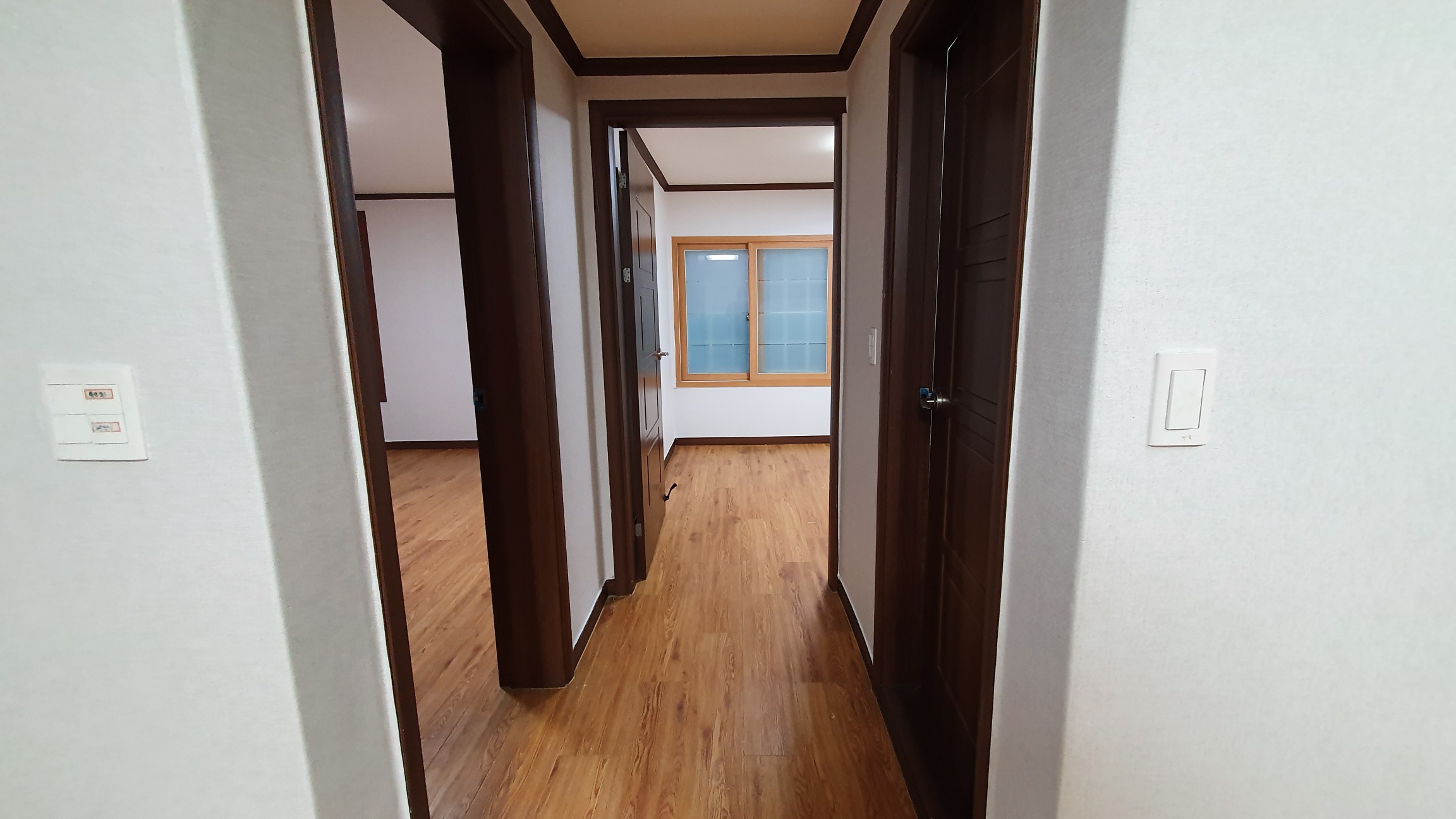 거실에서 찍은 사진으로 왼쪽과 정면에 방2개 오른쪽에 화장실, 사진 뒷편이 거실 입니다.