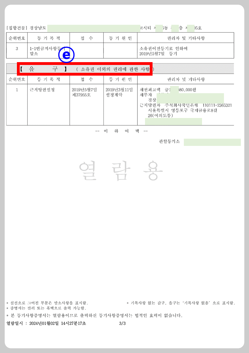 ⓔ: 을구 (소유권 이외의 권리에 관한 사항)