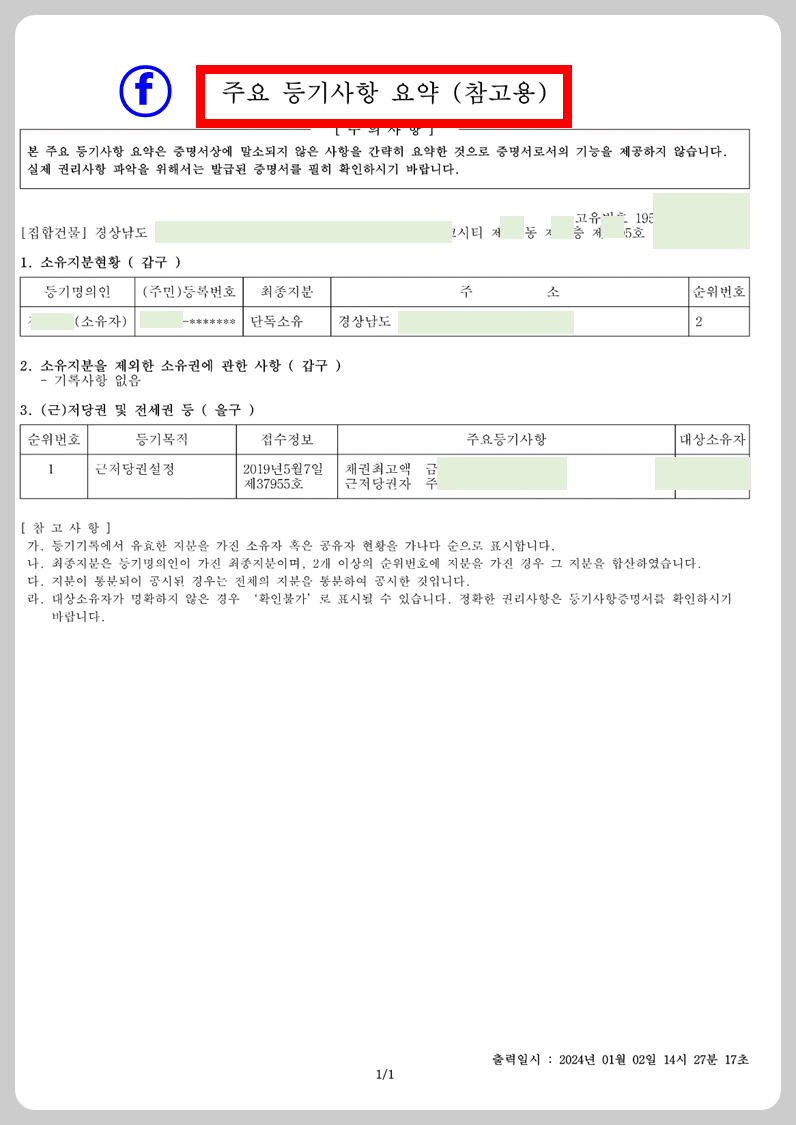 일반인들이 등기사항전부증명서를 보기 어렵다고 느낄때는 요 요약본만 보아도 권리관계를 쉽게 파악할수 있습니다.