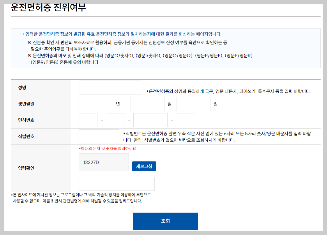 ※ 면허증은 경찰청교통민원24 이파인에서 로그인 후 확인가능합니다. 아래를 클릭하면 면허증 진위확인 으로 넘어갑니다.